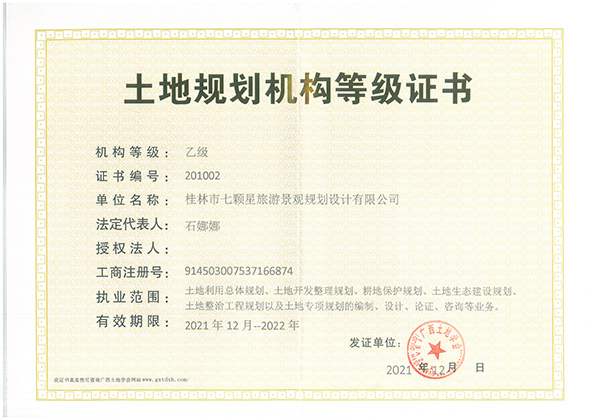 七顆星規(guī)劃?rùn)C(jī)構(gòu)2003年12月獲旅游規(guī)劃丙級(jí)資質(zhì)單位,2006年3月29日經(jīng)國(guó)家旅游局批準(zhǔn)獲旅游規(guī)劃乙級(jí)資質(zhì)。2010年10月獲得土地規(guī)劃乙級(jí)資質(zhì)。